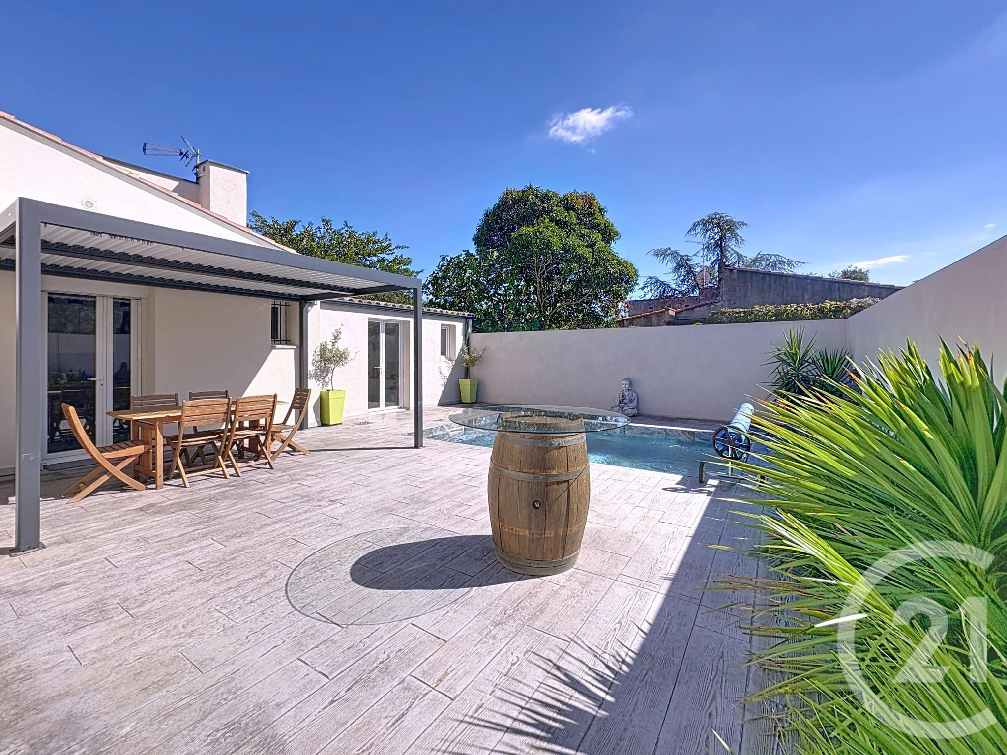 À l'arrière, une véritable oasis de détente vous attend : une piscine idéale pour se rafraîchir durant les chaudes journées d'été, ainsi qu'une terrasse partiellement couverte, parfaite pour profiter des repas en extérieur à l'ombre.